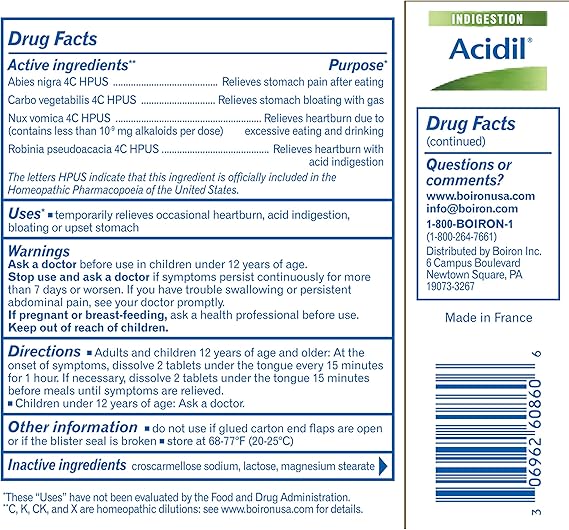 | Photo : Boiron Labs Acidil indigestion tablet - 60 per pack. Boirons Acidil gives temporary relief of occasional heartburn, acid indigestion or sour stomach. |
